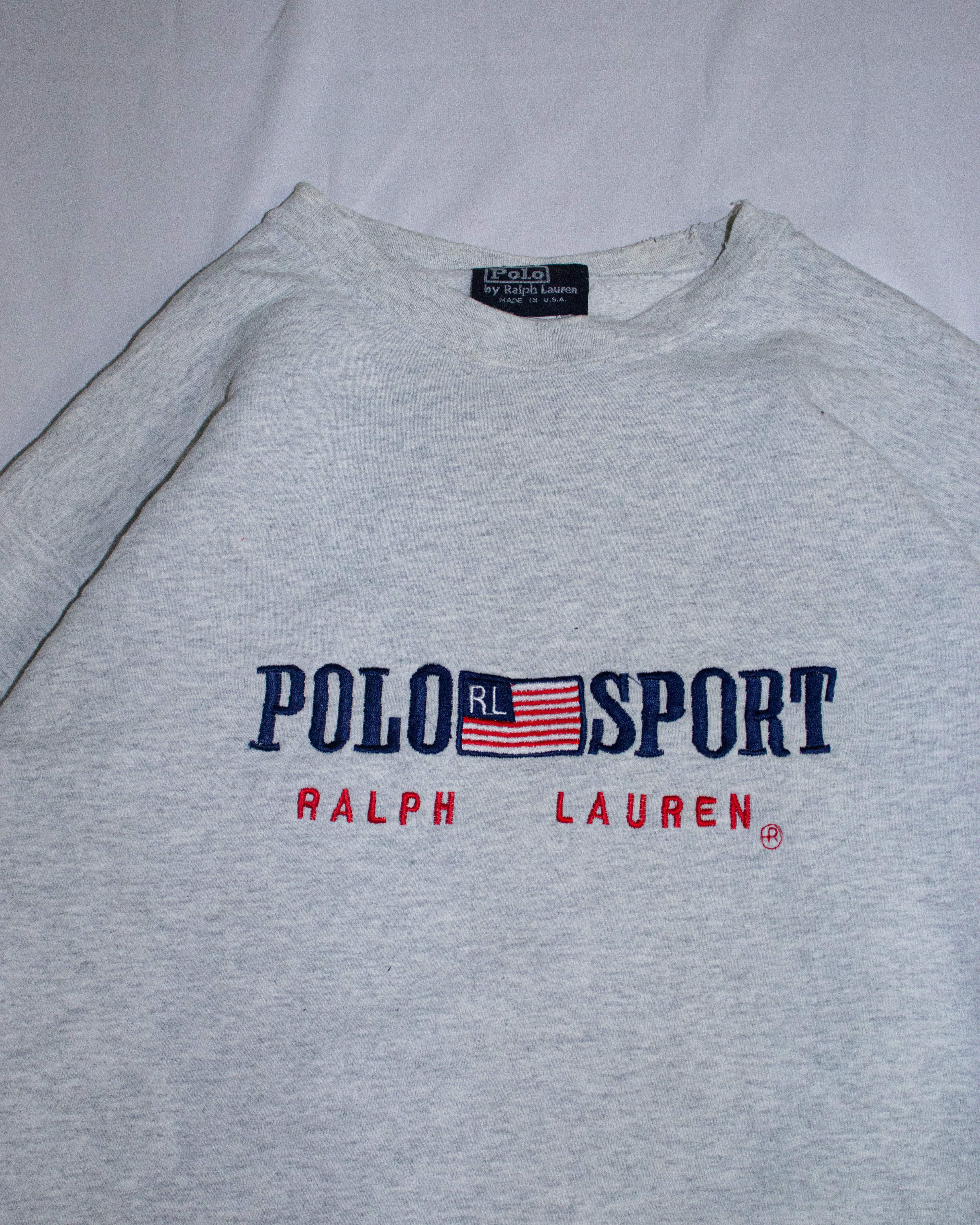 フロントにポロスポーツ風と、星条旗の刺繍ロゴが入っています。ボディーが90年代後半辺りのフルーツで、タグの上からラルフのタグが付けられためちゃくちゃなやつ笑